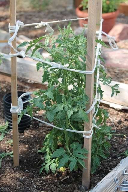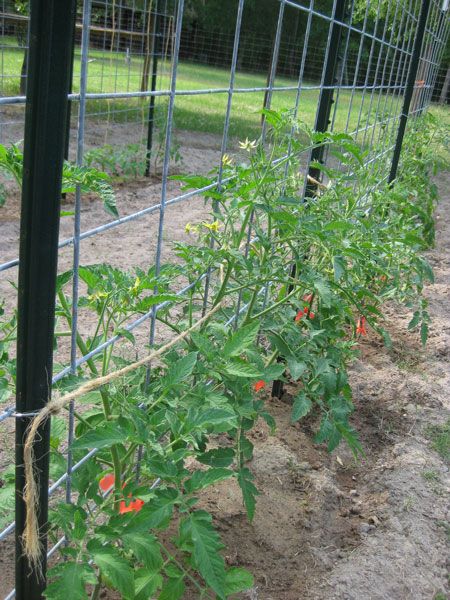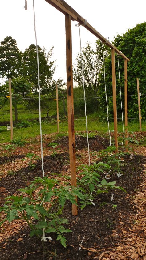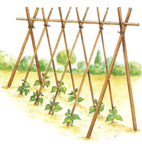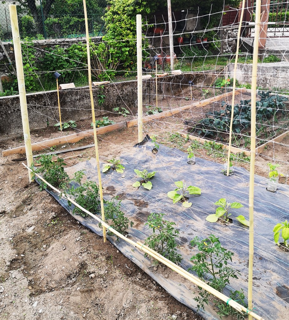 Lo scorso anno ho usato i pali di bambu’ a cui ho legato ogni singola pianta ed e’ stato un macello! Anzi, ne approfitto per sconsigliarvelo come palo da sostegno per la pianta. Essendo liscio, il laccetto con cui la legherete non fara’ presa e vi cadra’ giu’. Tenete poi presente che le piante diventano alte e che poi in periodo di produzione sono pesanti. Meglio vecchi pali rovinati, ruvidi in cui il laccetto non scivola. Io in questo caso li ho utilizzati ma non andranno a supportare la pianta ma la struttura, questa sara’ legata alla griglia di cavi.