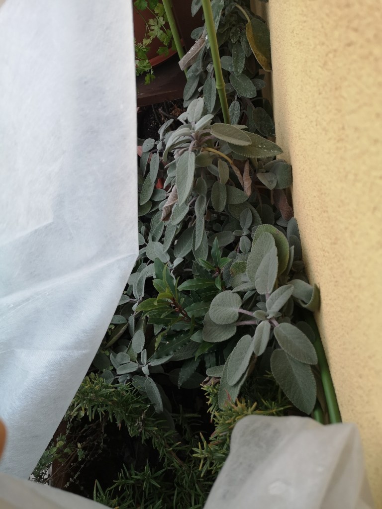 Questa volta, invece del solito telo di plastica le ho coperte con il “telo non telo”. Una precedente bufera di vento notturna, non so come, me lo ha fatto volare via. Quindi ho cercato di farla con quello che avevo.