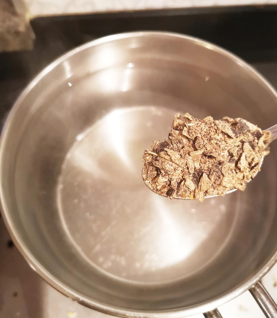 Faccio bollire l’acqua in un tegamino, appena si intiepidisce aggiungo un paio di cucchiai di te’ e lascio raffreddare.
