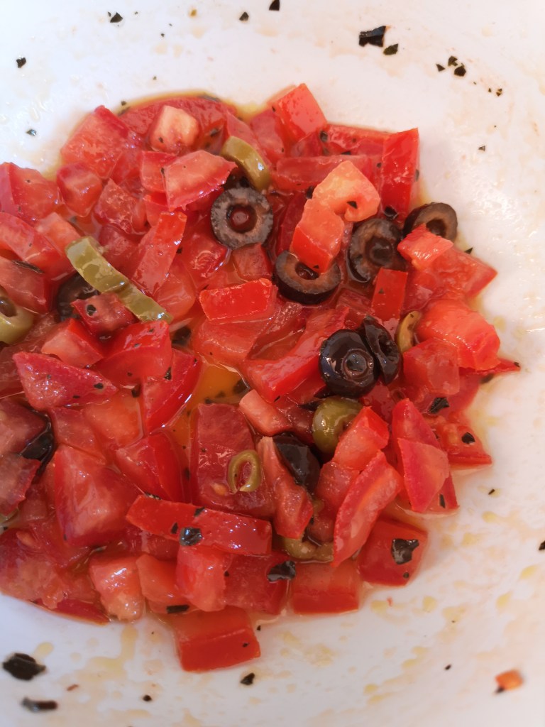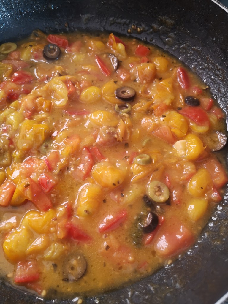 Avevo anche un’ po’ di pomodori e olive gia’ tagliati, freschi, dalla sera prima, li ho buttati anche loro in padella.