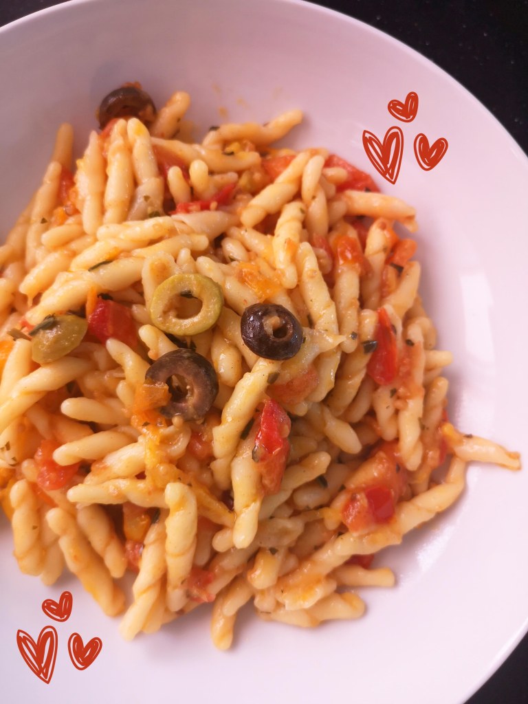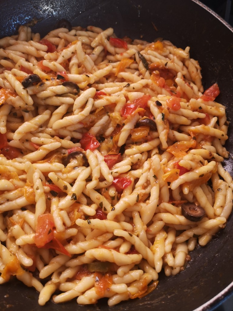 Un pacchetto di trofie fresche e uno dei miei vasetti di pomodorini che metto via in estate. Questa volta li ho usati gialli, conservati con aglio e basilico.