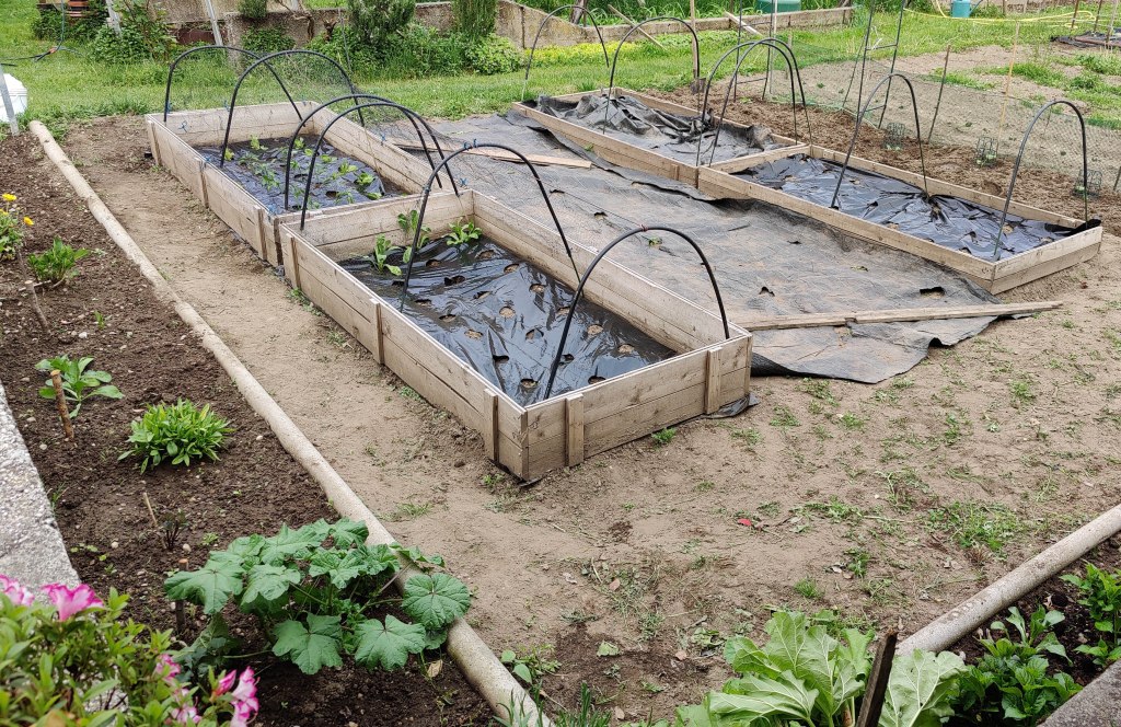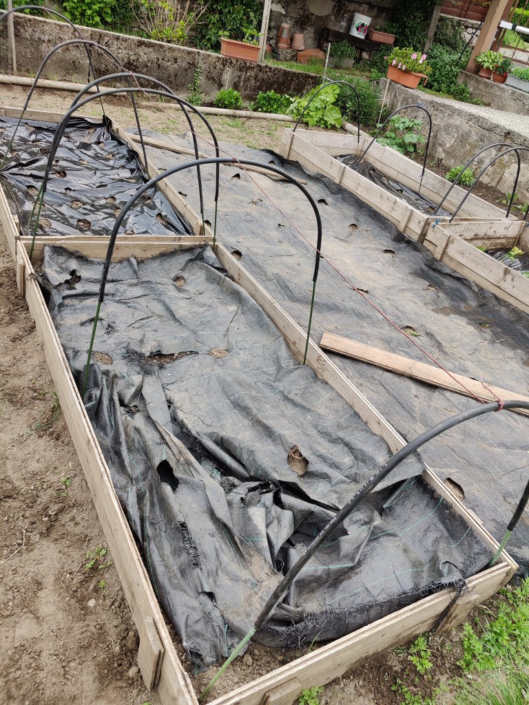 Fatto cio’, ho dato una bella concimata nei box e ho subito irrigato. Nelle zone in cui andro’ a mettere le piante, senza usare i box, ho coperto con il telo nero, per la pacciamatura, sperando di ridurre la crescita delle infestanti.