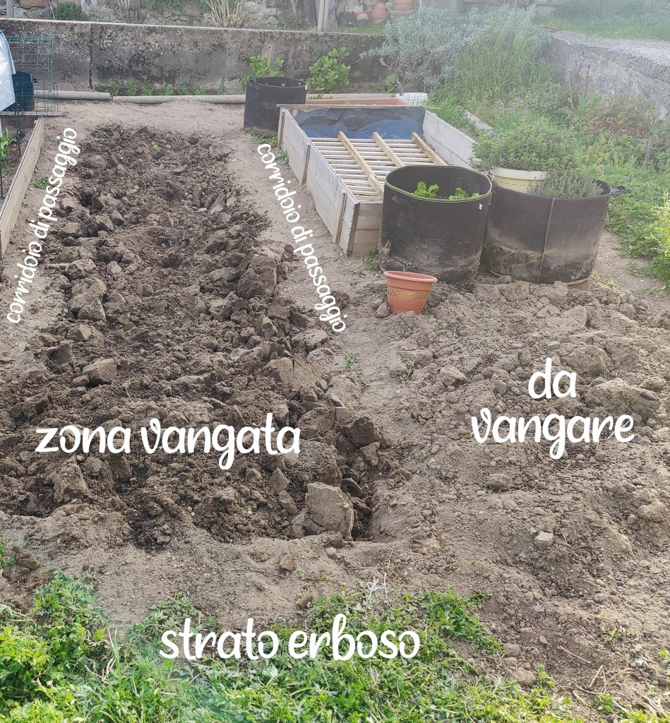 In questa data, ho cominciato a zappare solo le zone in cui, volevo mettere a dimora le piante, evitando i corridoi di passaggio, alla massima profondita’ della pala.