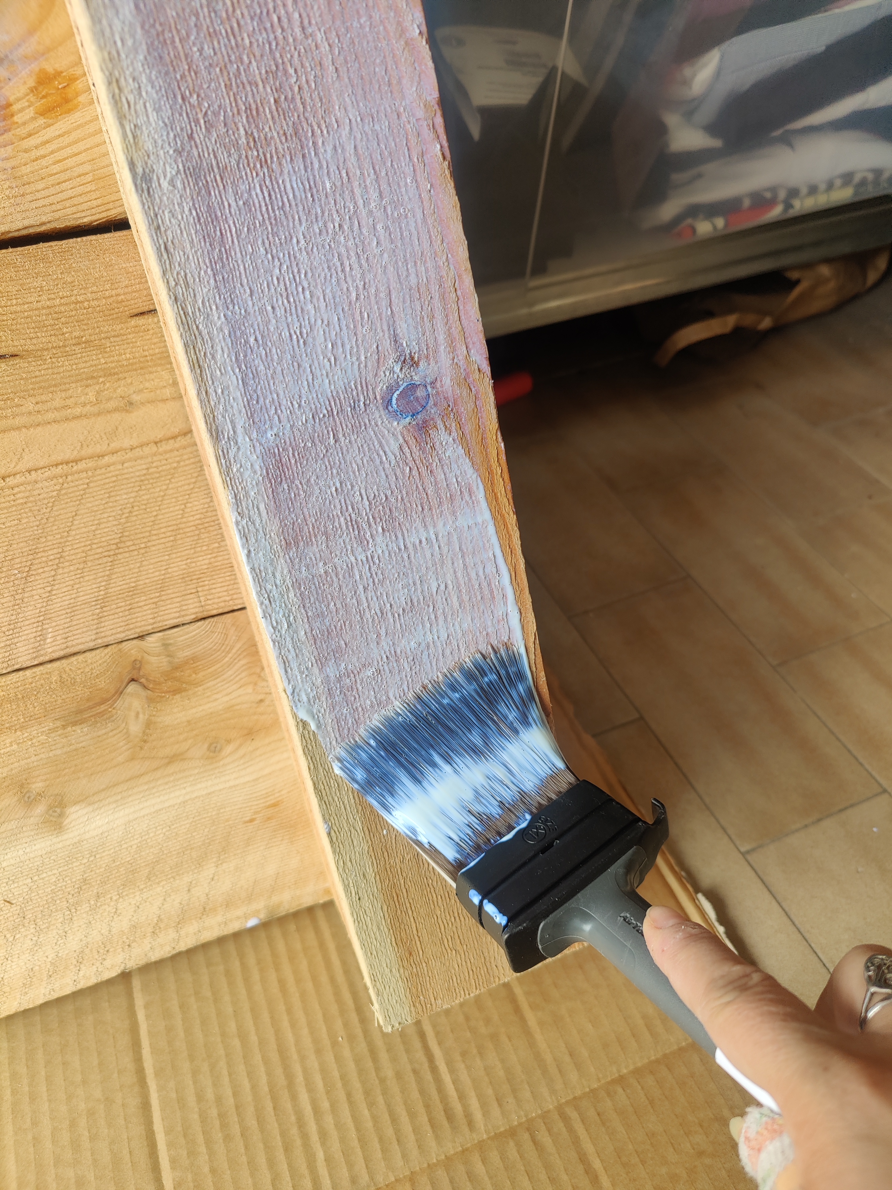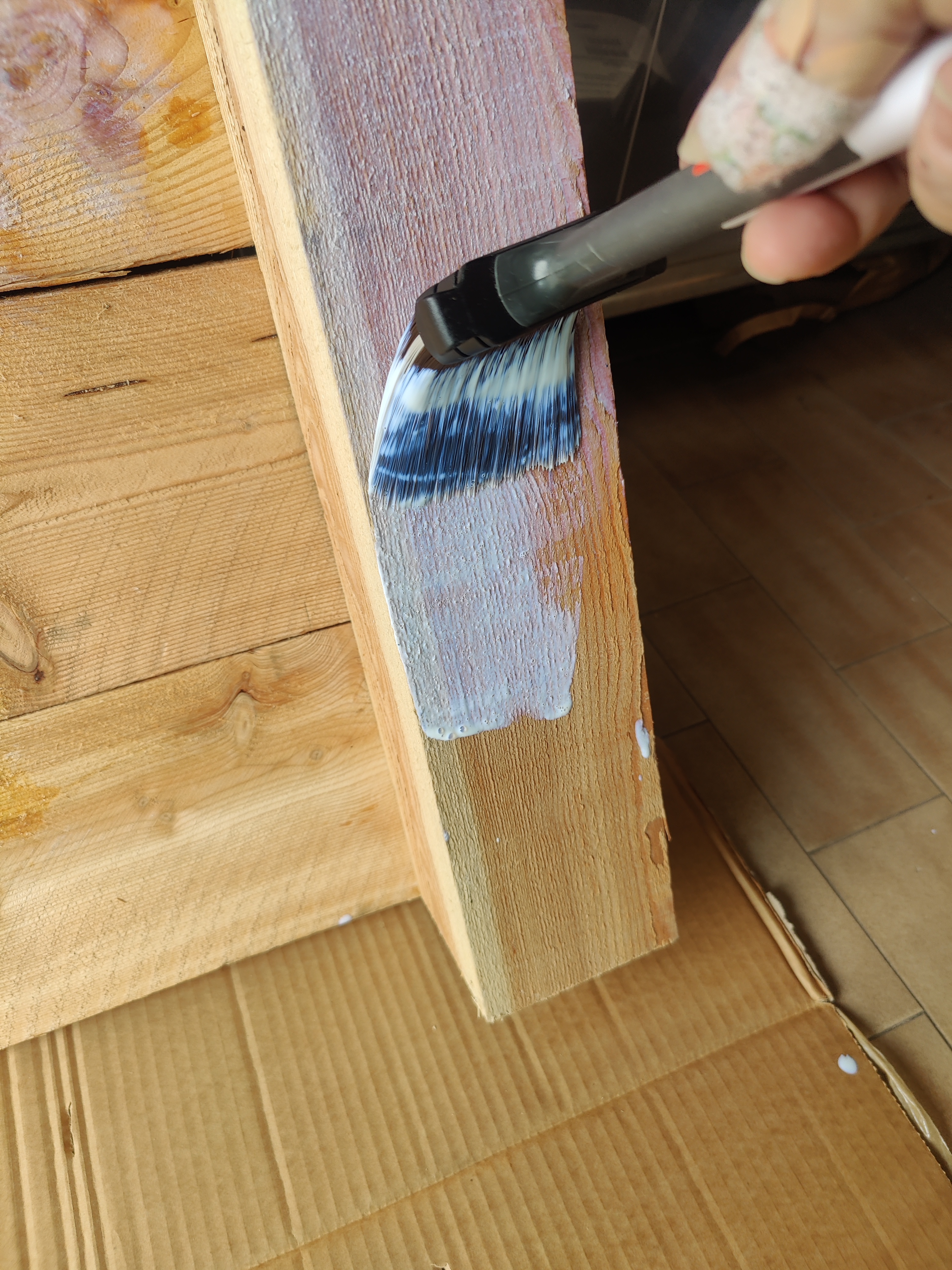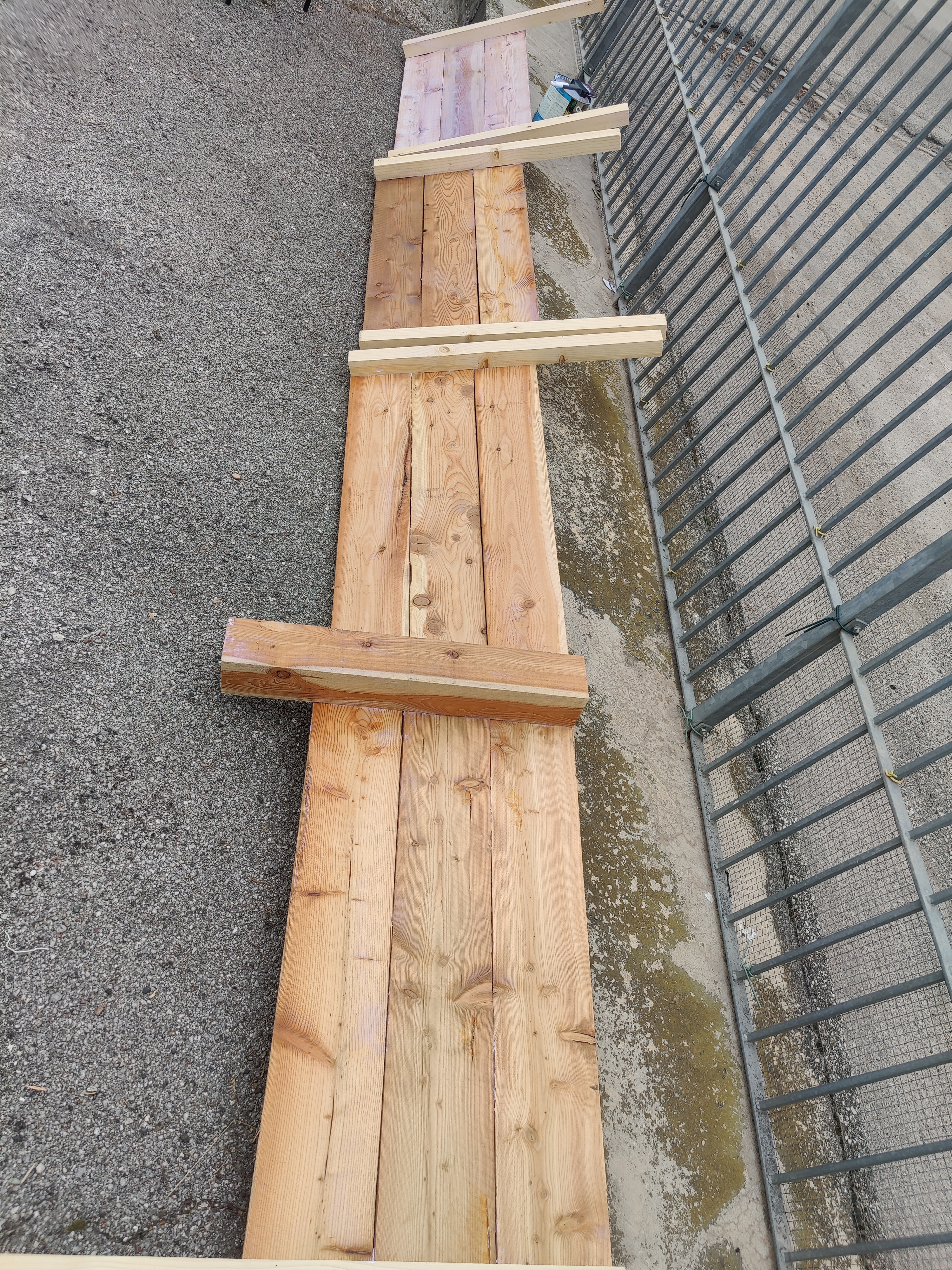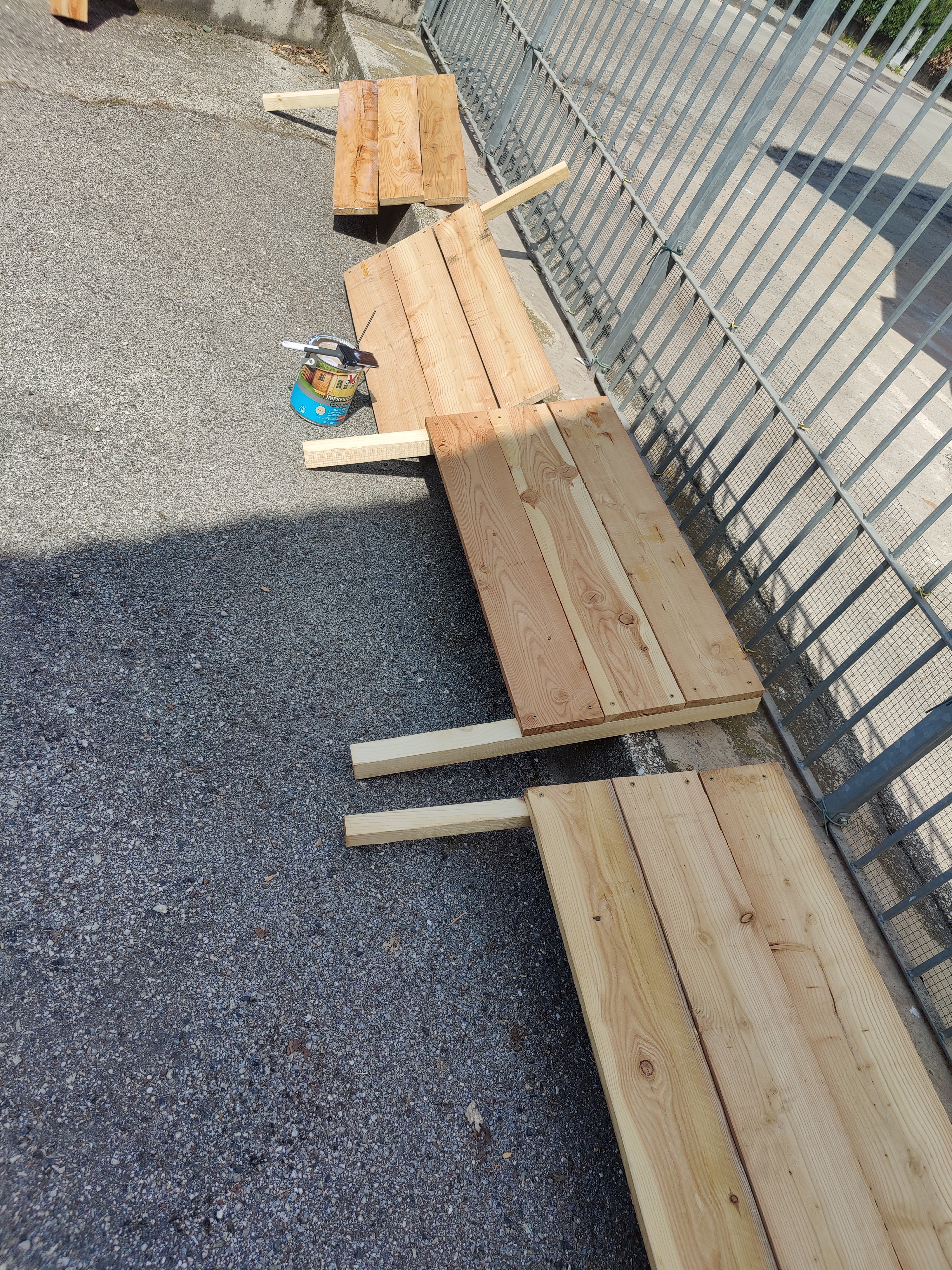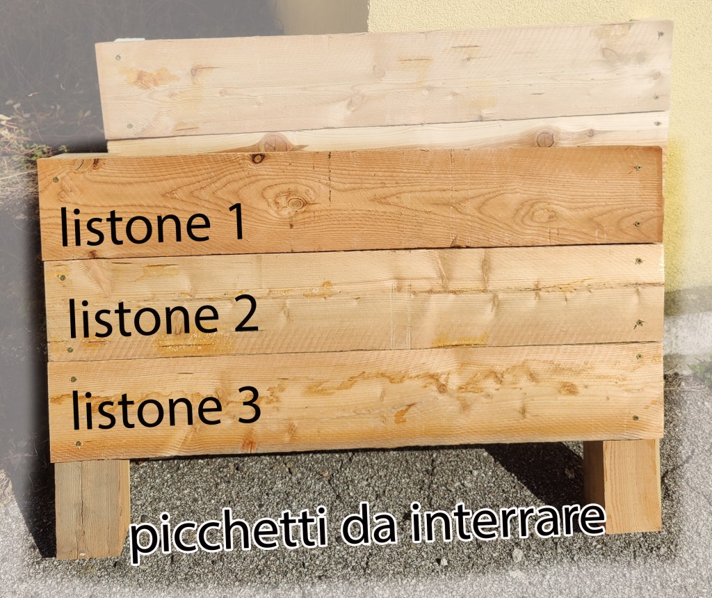 Una volta fatto i moduli ho voluto dargli due mani di impregnante per il legno. Comunque sono assi che stanno sempre fuori, sottoposti a ogni temperatura e intemperia. Per non parlare poi dei picchetti che sono interrati nel terreno. Ovviamente un impregnante che non rilasciasse sostanze nocive nel terreno.
