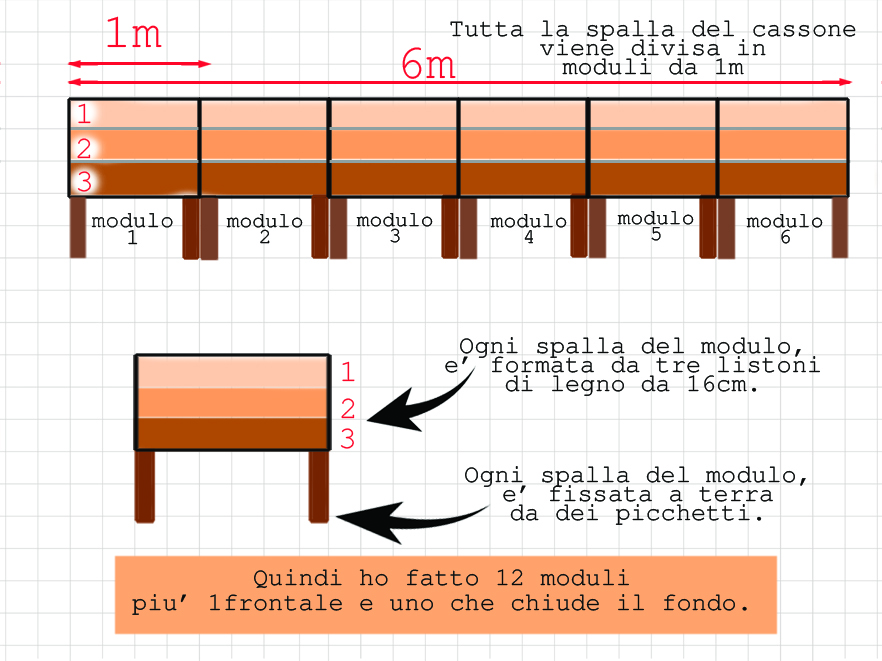 Penso che l’immagine renda bene. Di questi moduli, ne ho dovuti fare 12 per le fiancate laterali del cassone, in piu’ uno che chiude la parte frontale e uno che chiude il retro, per un totale di 14 in tutto. Tutto questo per fare il CASSONE 1