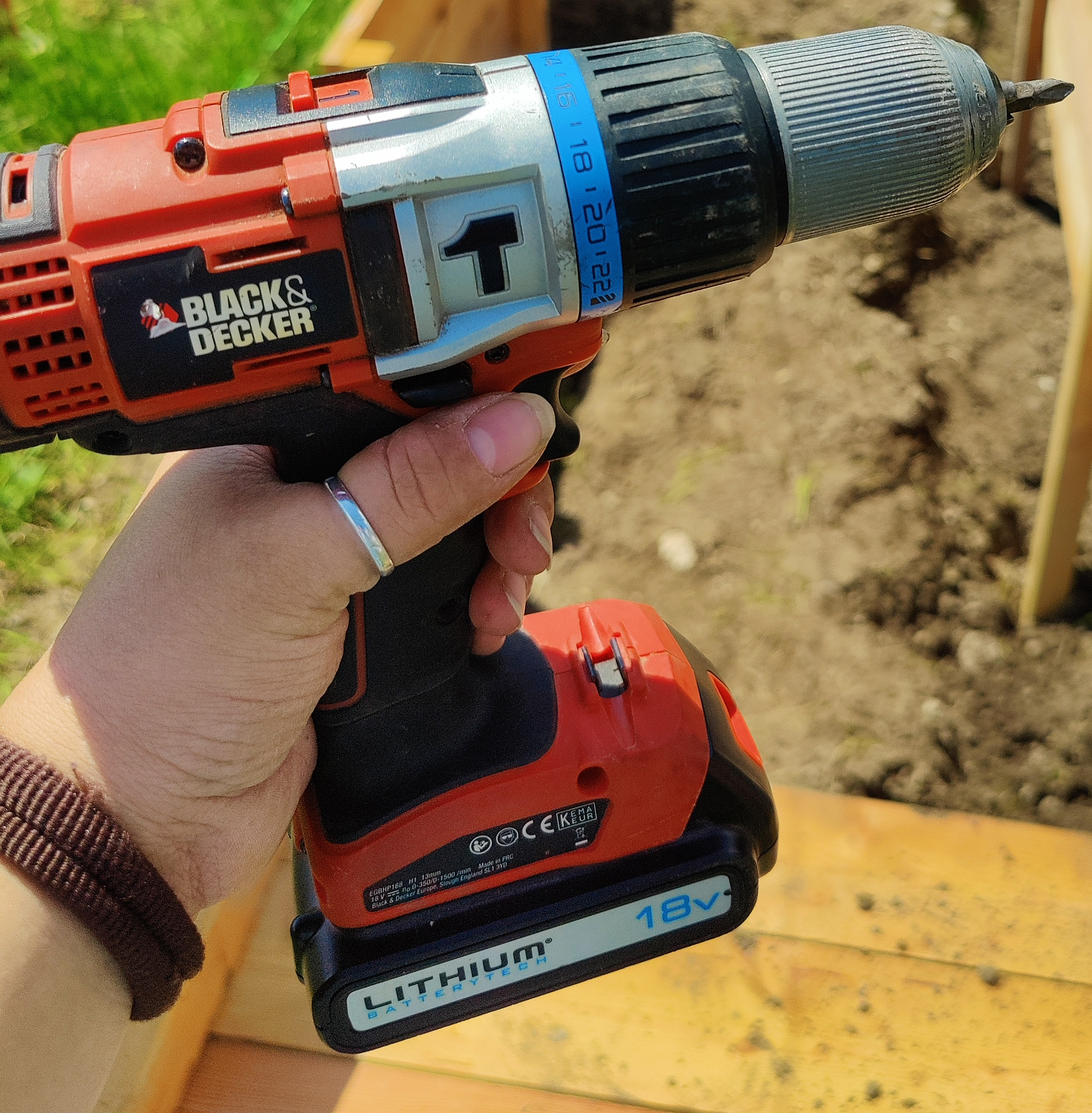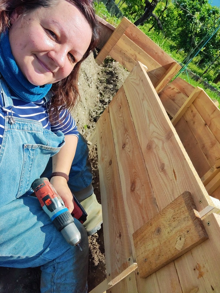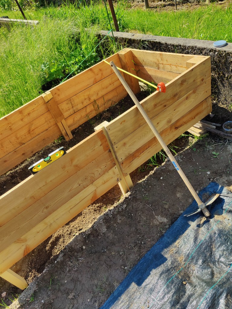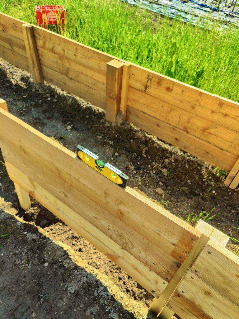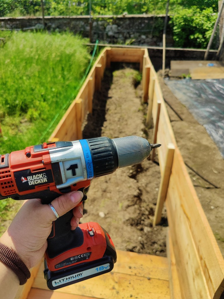 Il giono dopo, piu’ carica che mai, mi sono munita di tutto il materiale occorrente, trapano, viti, livella, bolla, metro, rotella metro, vari picchetti e armata di buona volonta’ ho cominciato a finire il primo cassone.