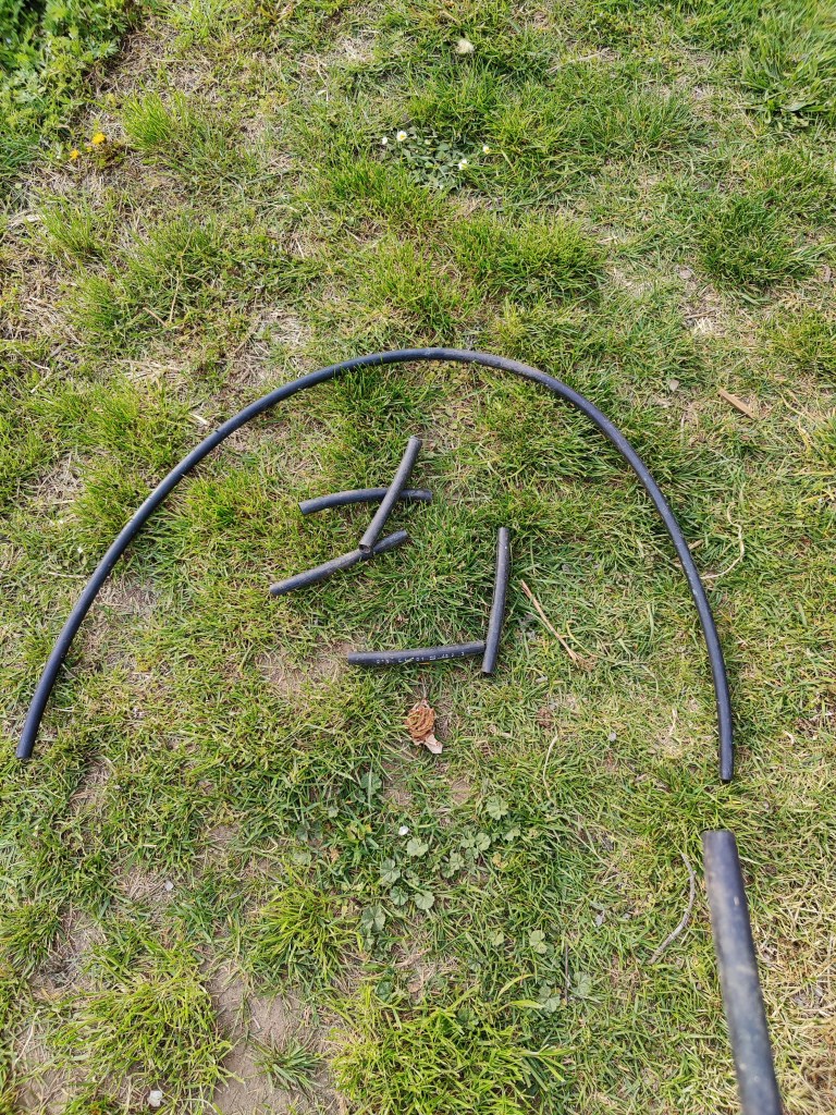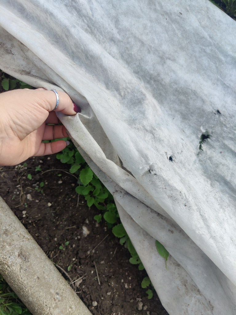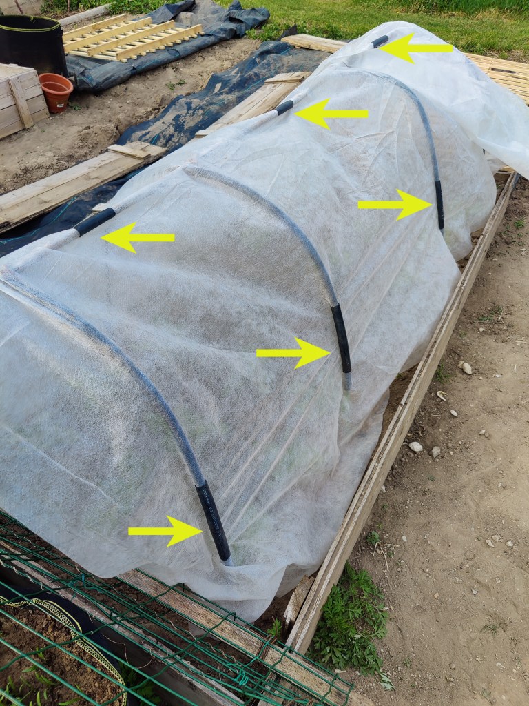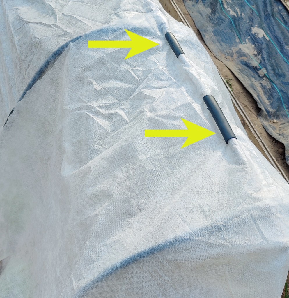Ho ricoperto il tutto con il telo non telo e, per bloccarlo, ho utilizzato pezzi di tubo rimanenti dagli archi, tagliati verticalmente …