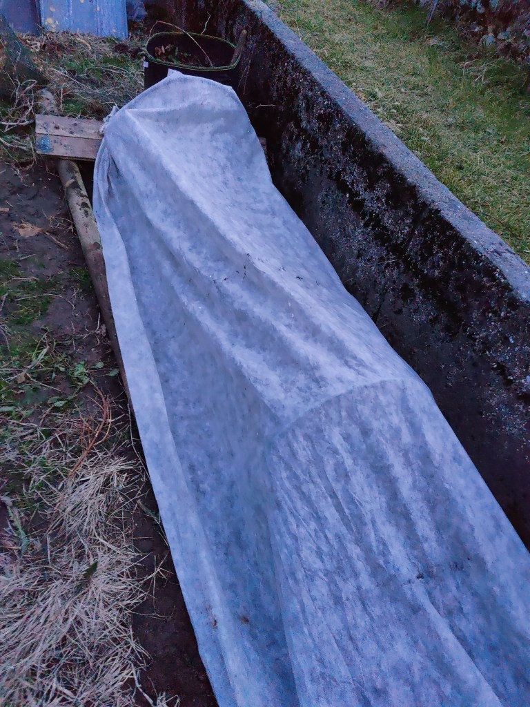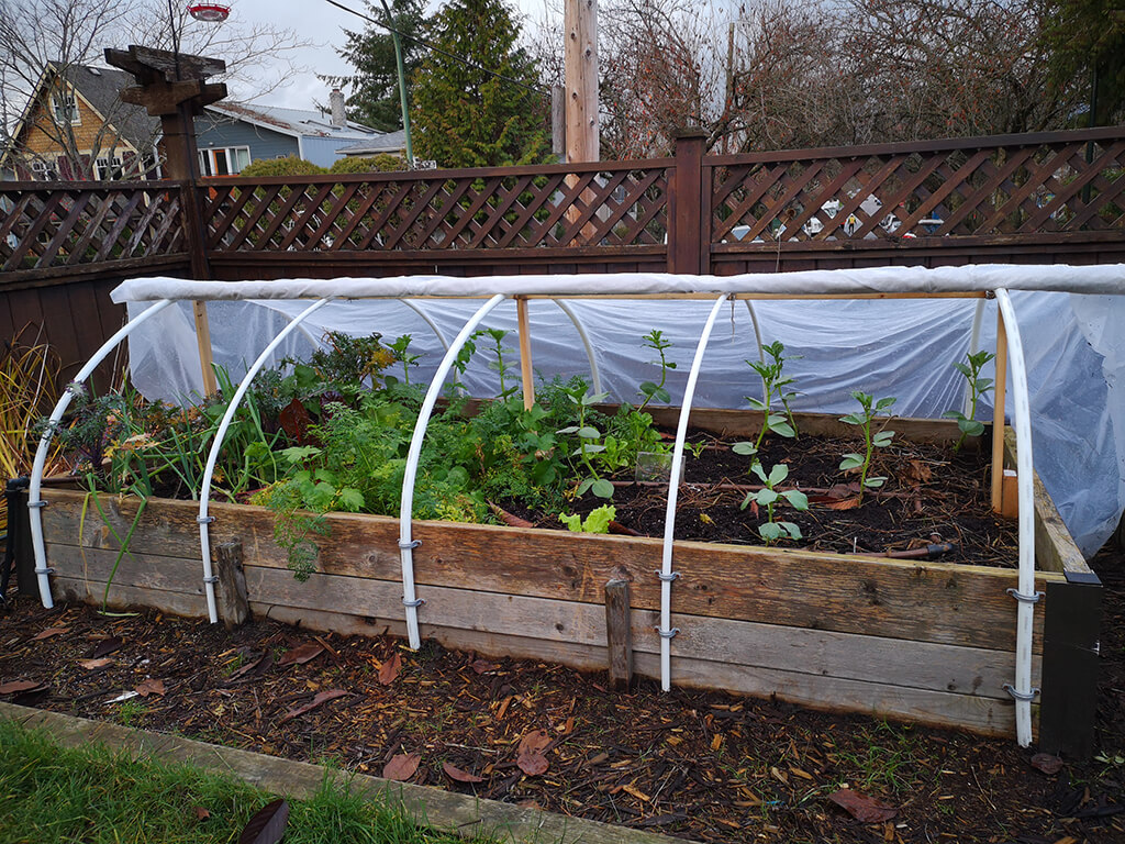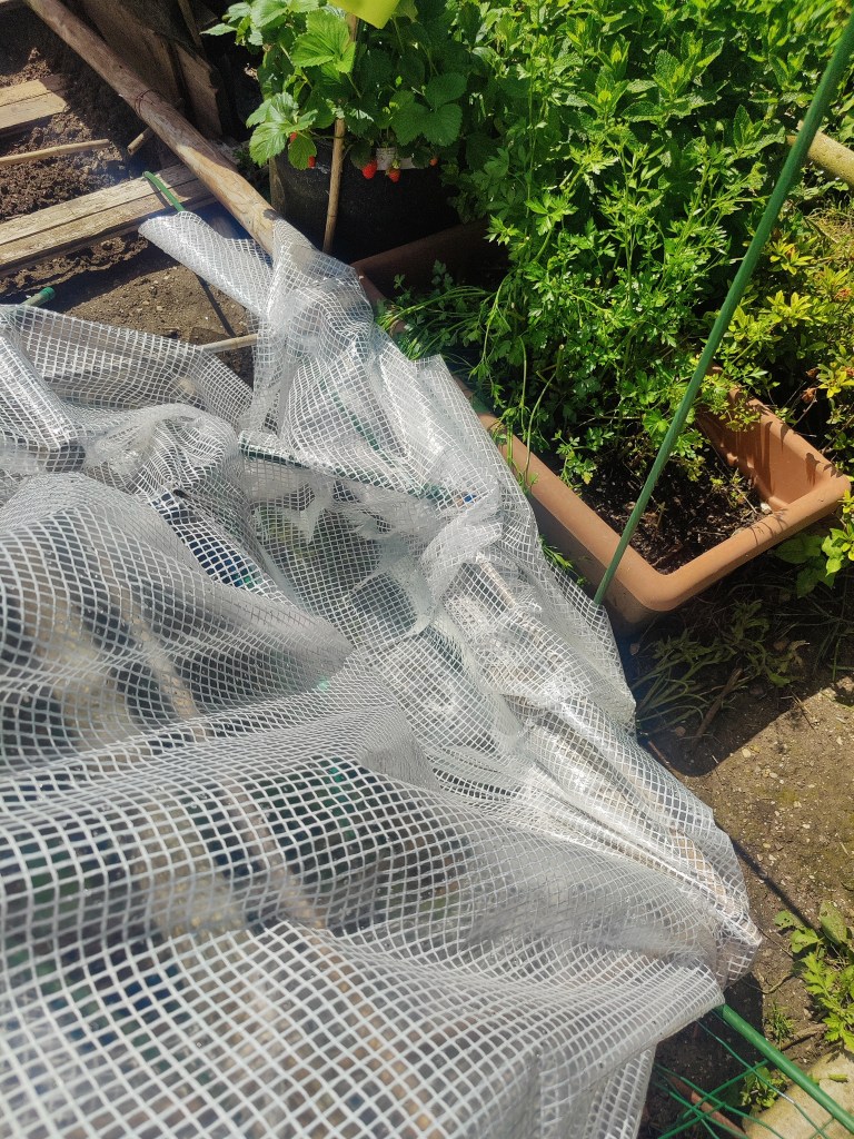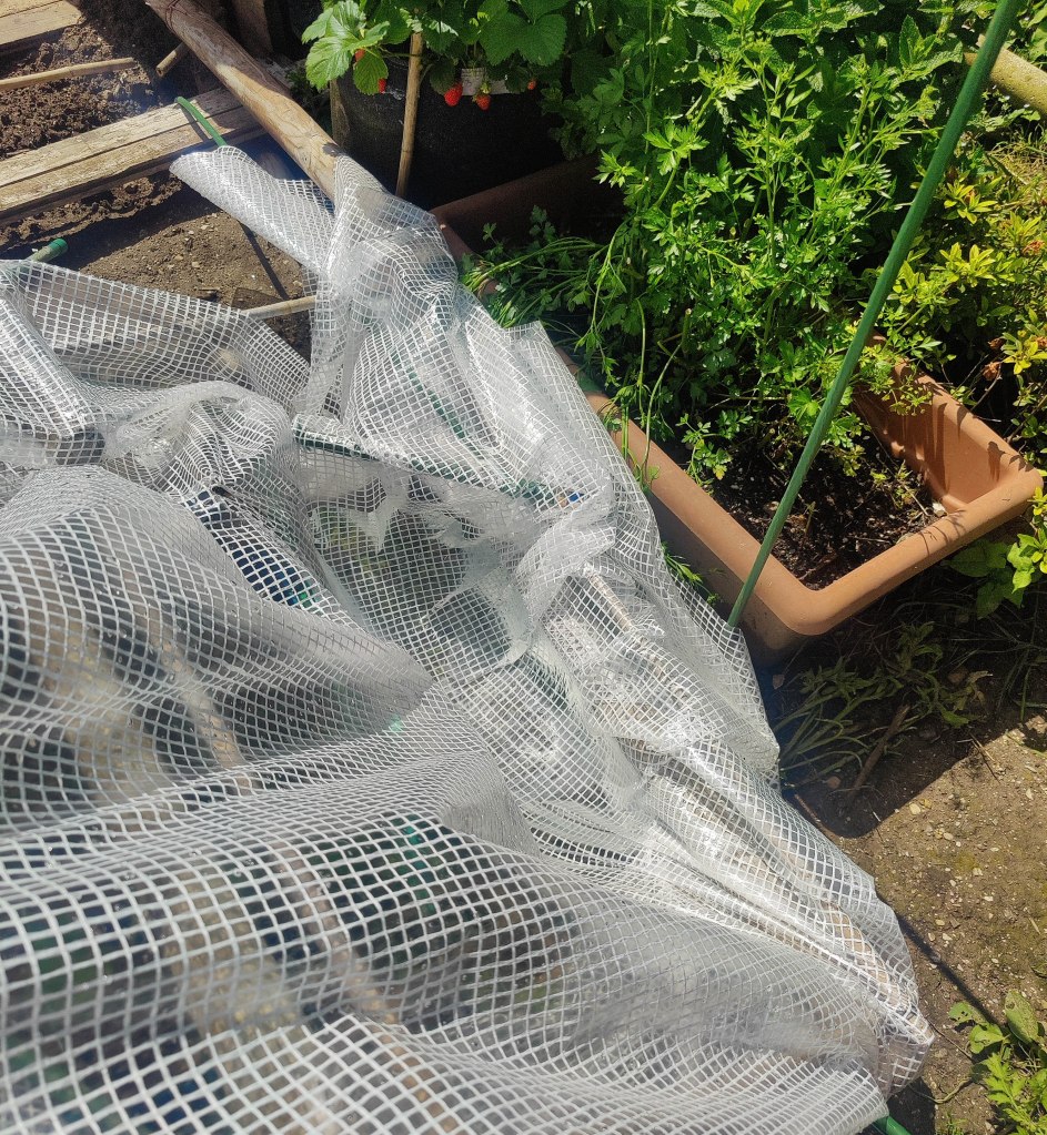 Ho ricoperto il tutto con il telo non telo e, per bloccarlo, ho utilizzato pezzi di tubo rimanenti dagli archi, tagliati verticalmente …