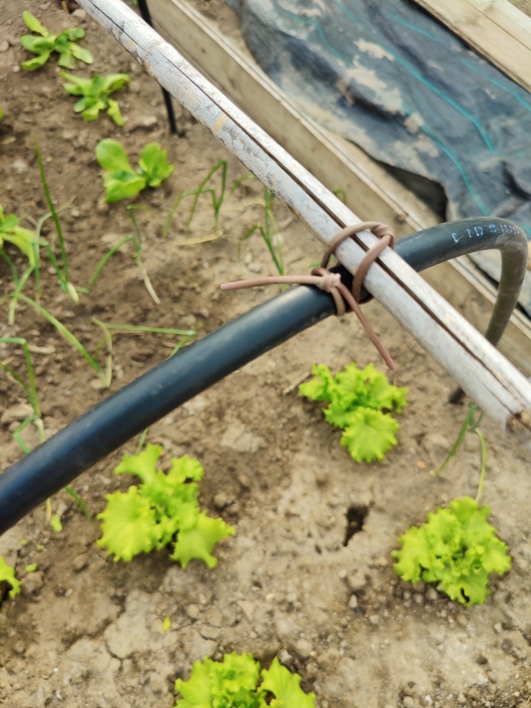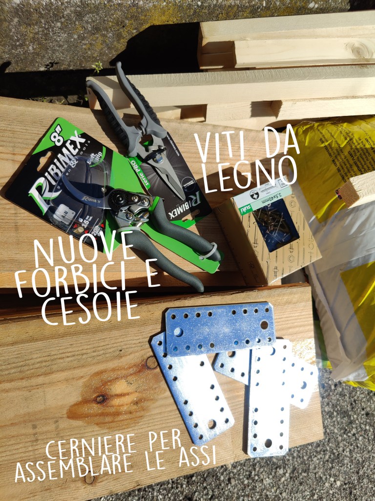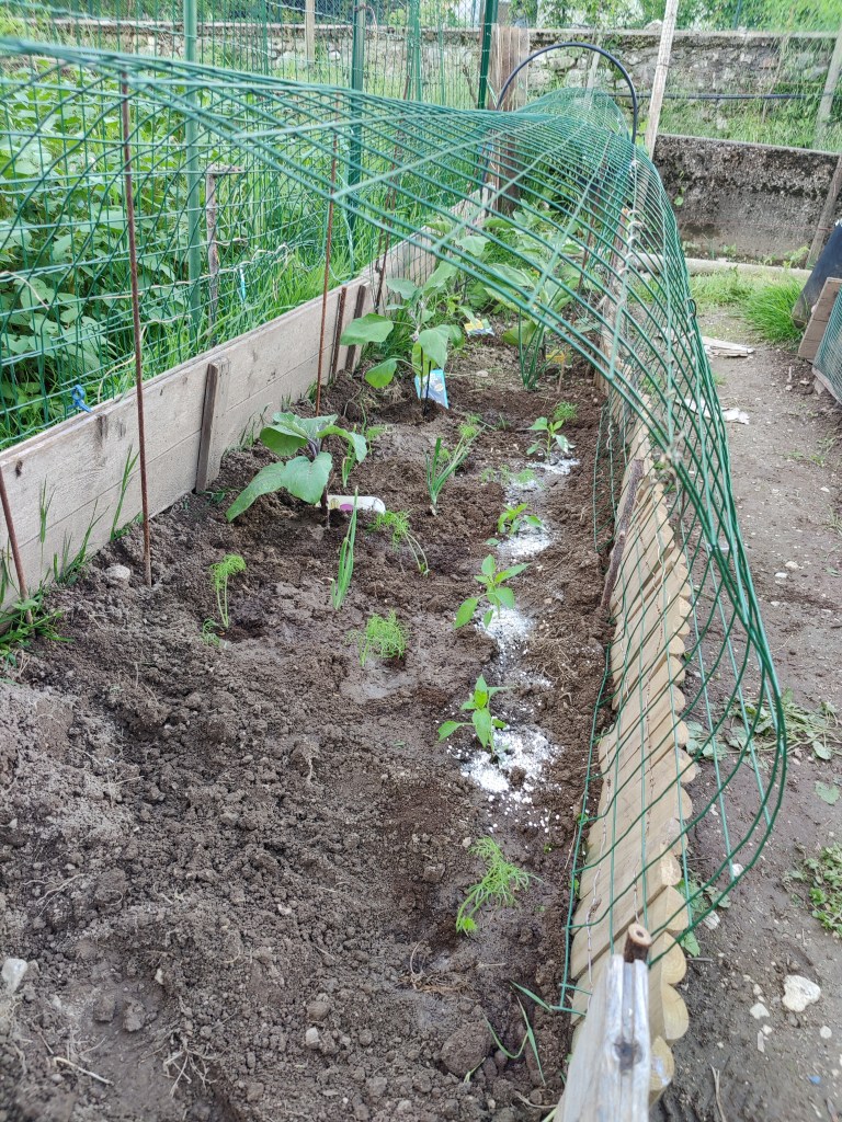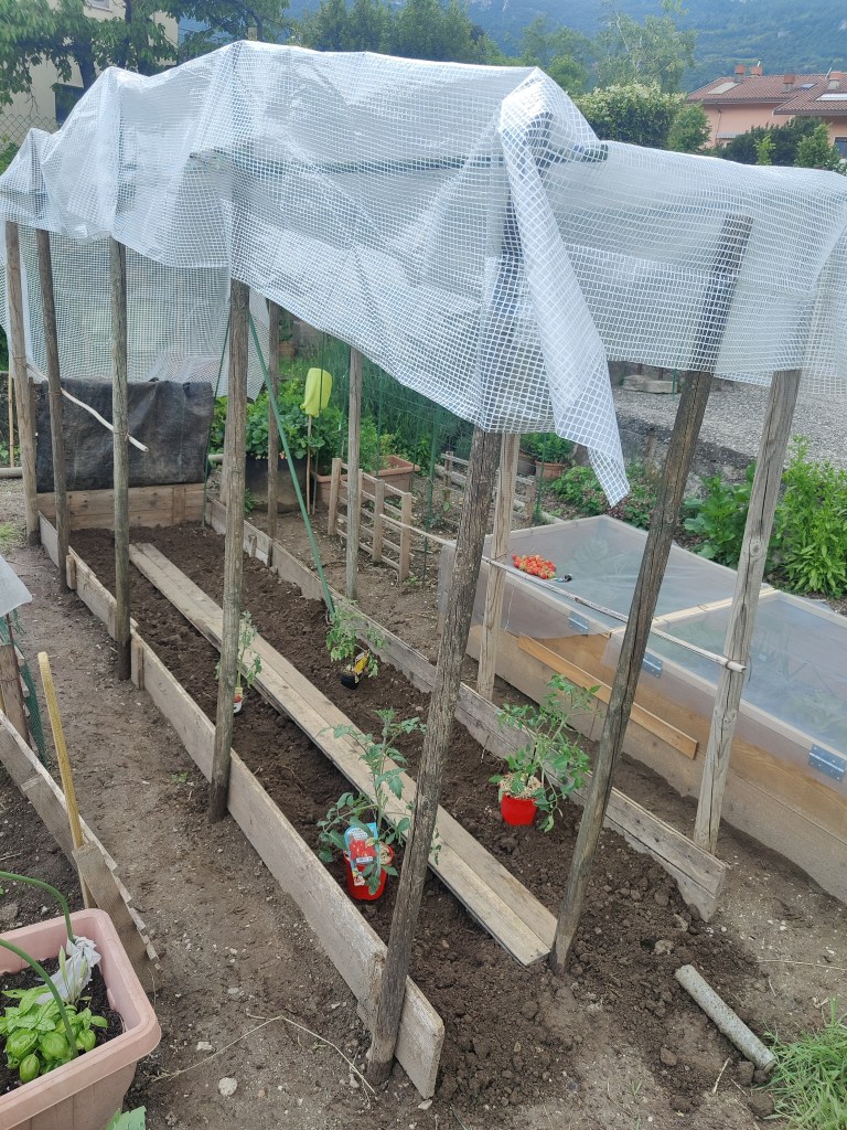 Come vedete non serve gran che’, tutte cose facilmente reperibili ed economiche. Io ho anche recuperato tanto materiale, degli scorsi anni. Ho ricreato il box con le assi che ho da sempre (perche’ ogni fine stagione, li smonto per riuscire a , metterli via. Ho messo dei paletti laterali, ben piantati a terra, nei quali sono andata a il filare le porzioni di tubo nero(quello per le irrigazioni per farvi capire meglio), creando cosi’ un arco. Li ho fissati ulteriormente bene tra loro, tramite canna di bambu’, alla quale li ho legati tramite nastro. Tutto questo per cercare di dare stabilita’ e reristenza alle bufere di vento, che qui capitano spesso.