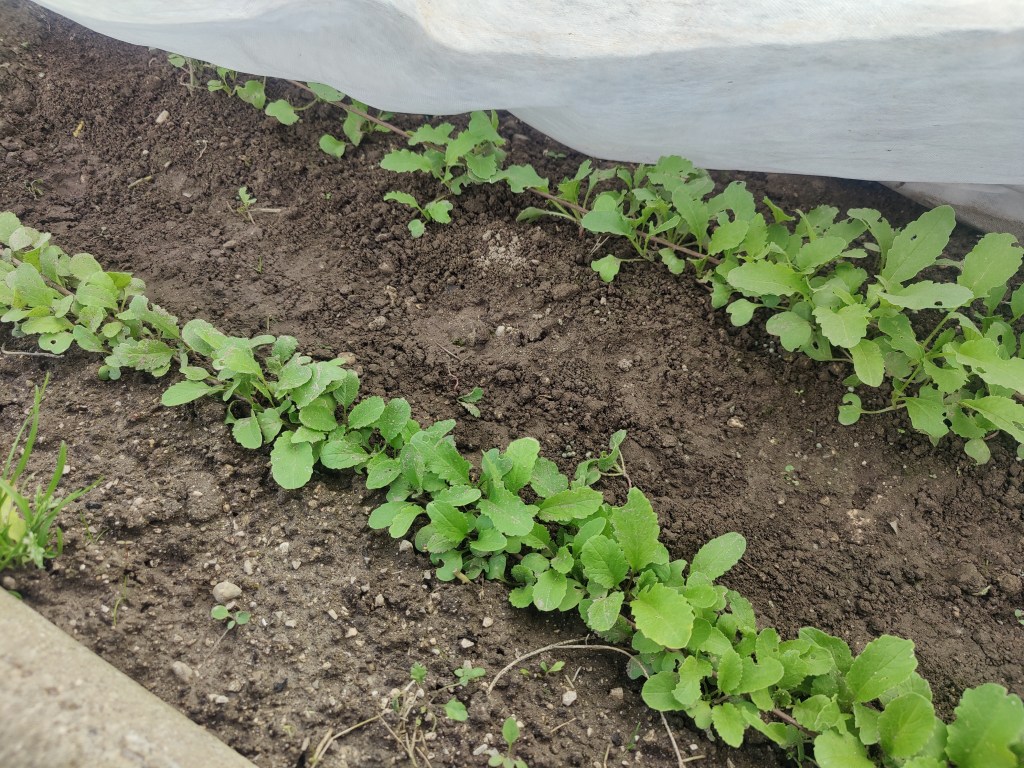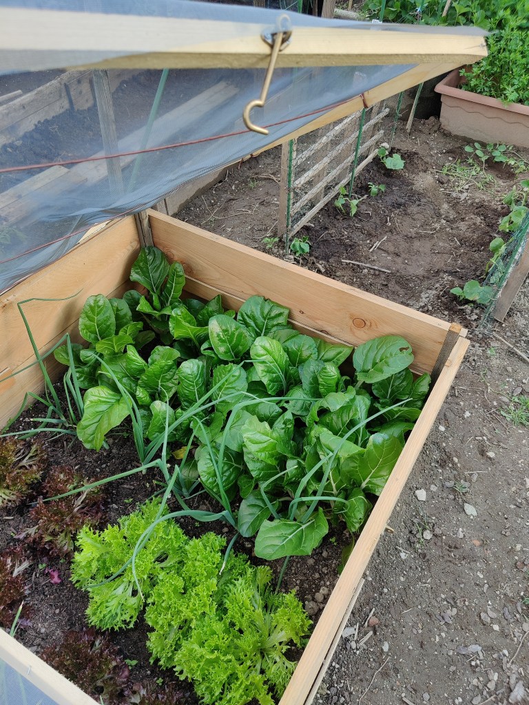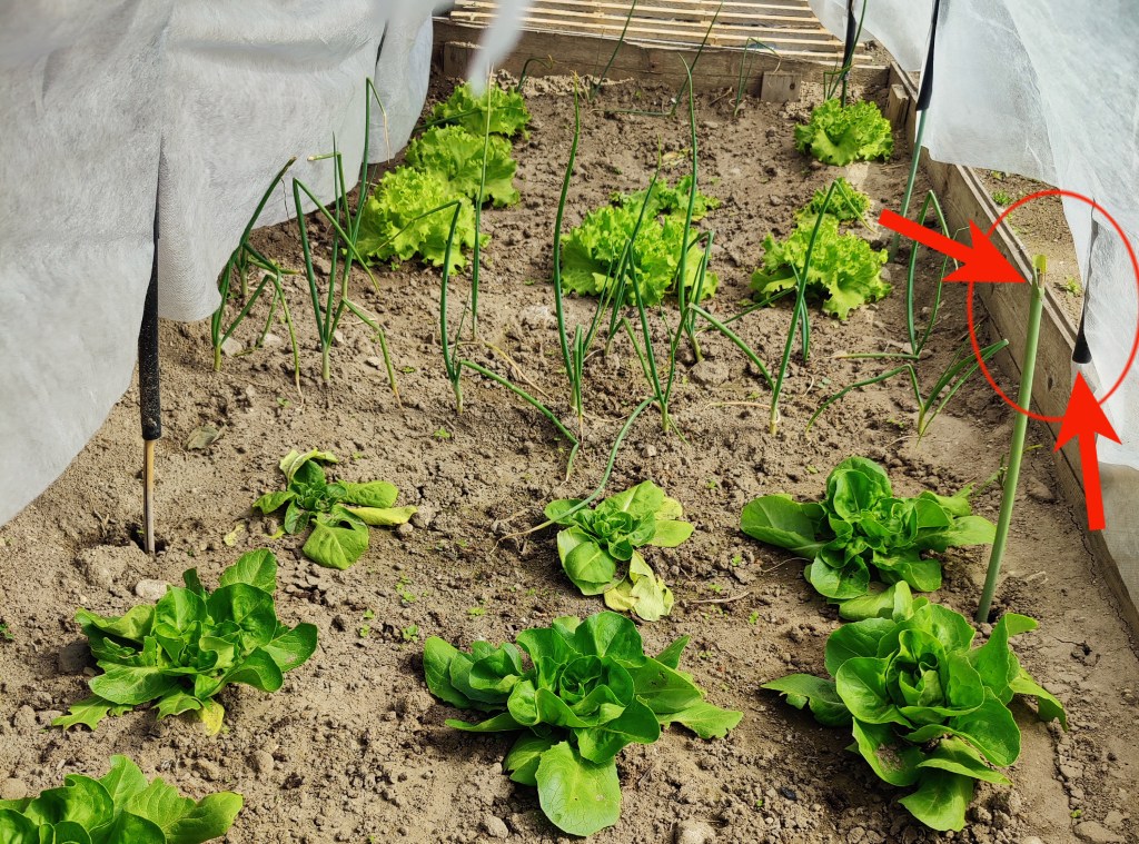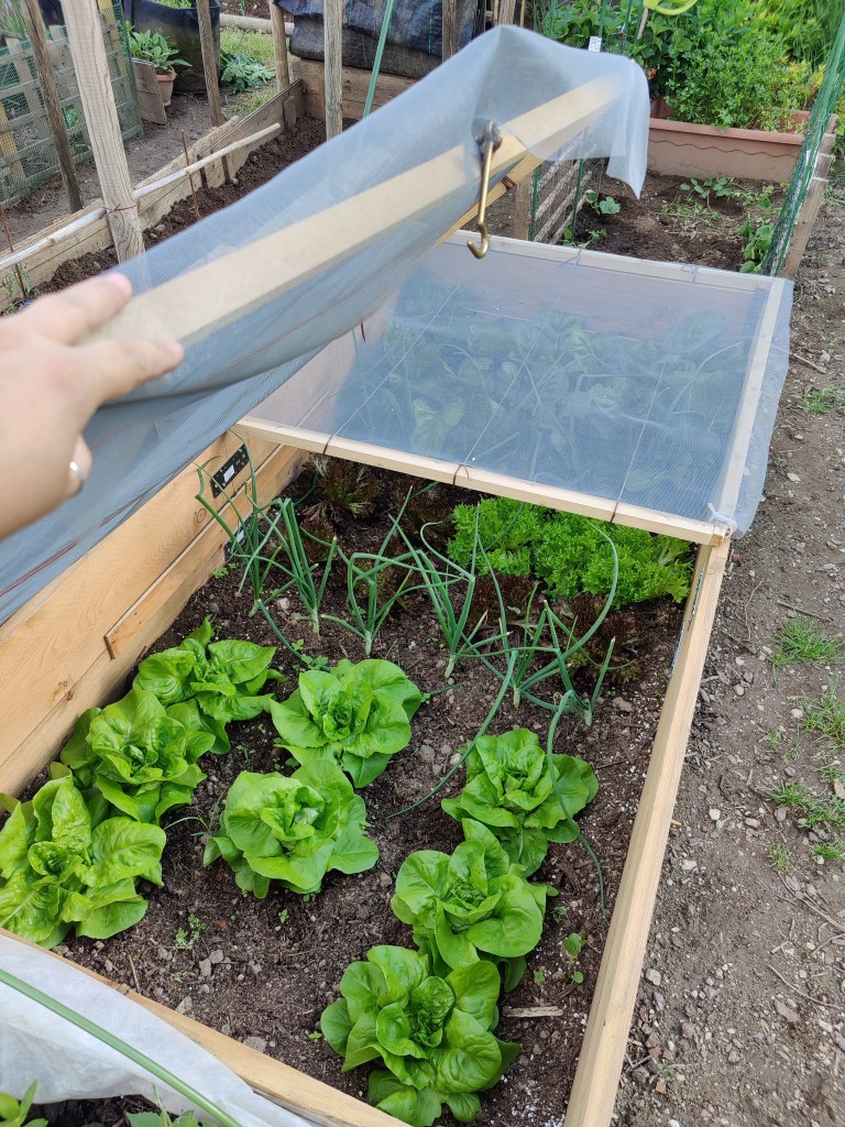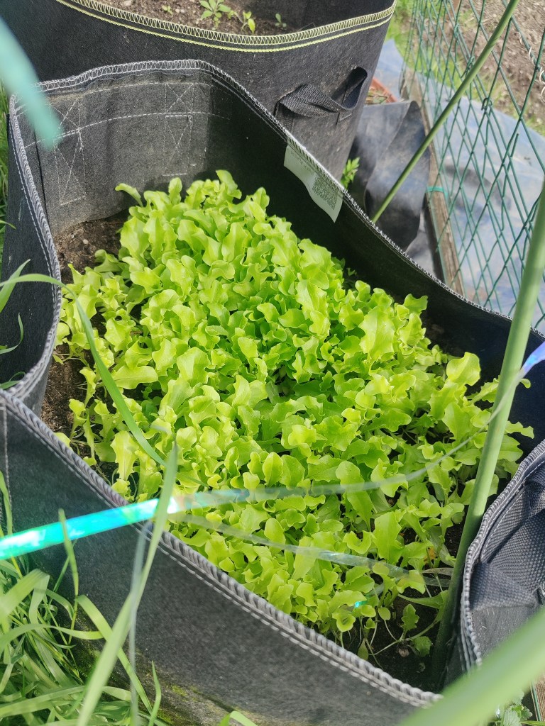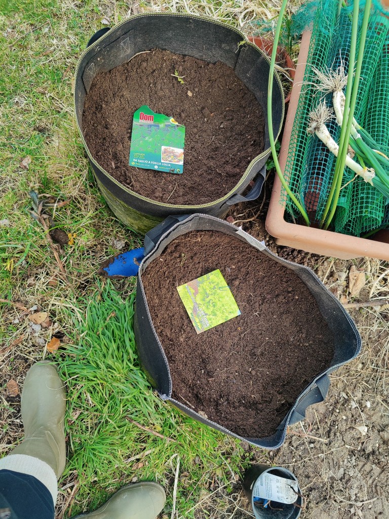 Fatto cio’ ho messo a terra le piantine di insalata di vario tipo che ho preso e le cipolle. Ben coperte e protette dalle lumache sono cresciute benissimo!