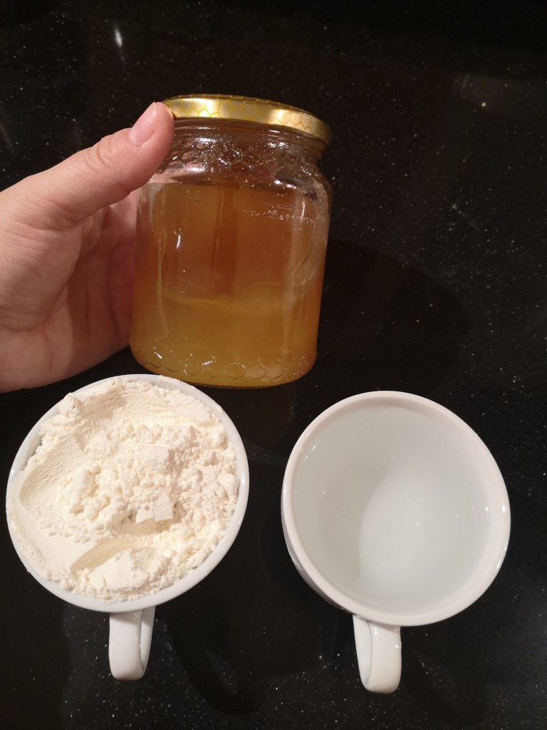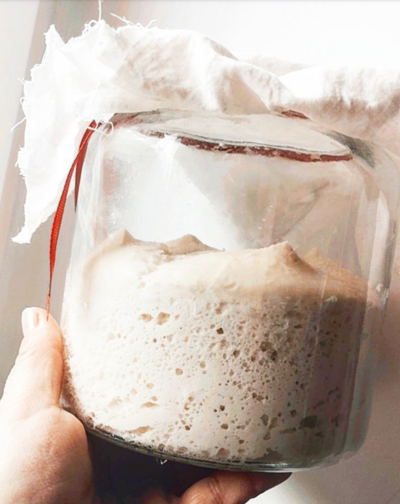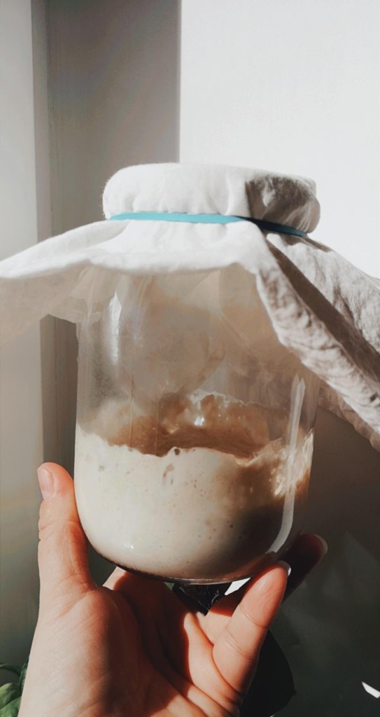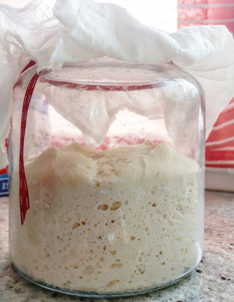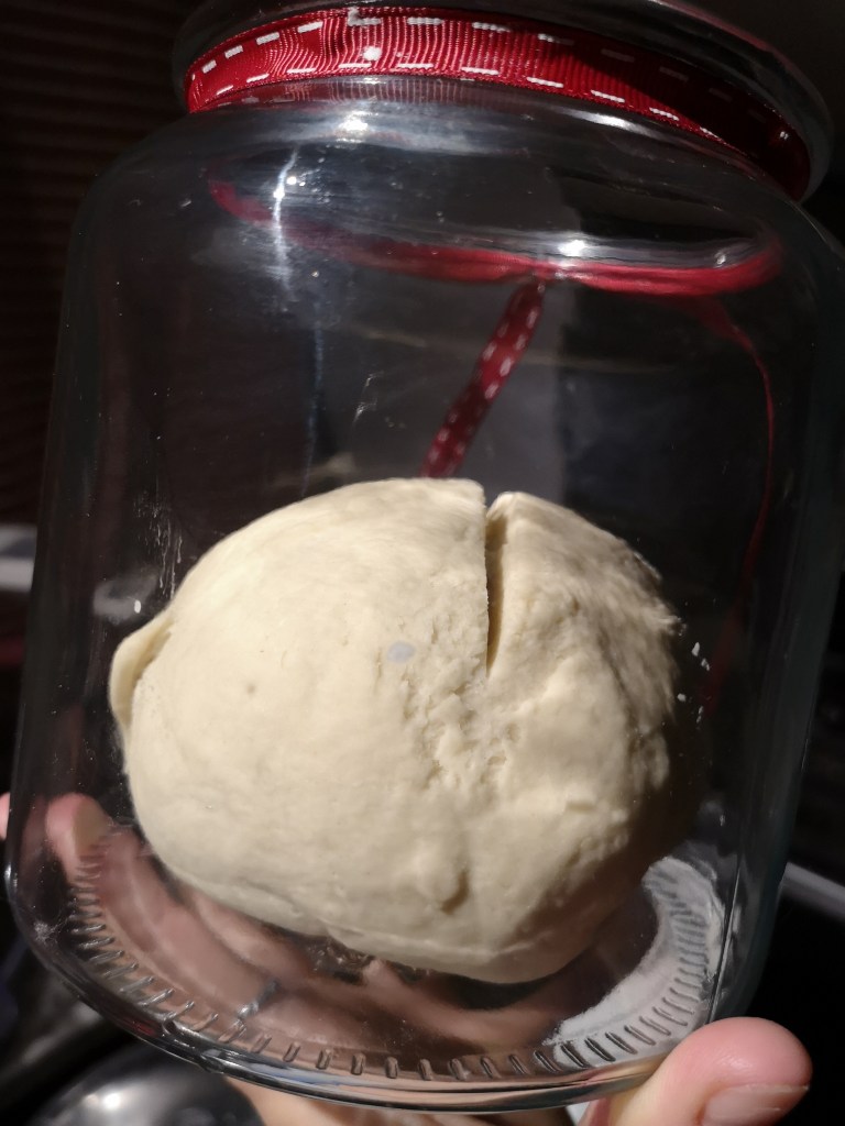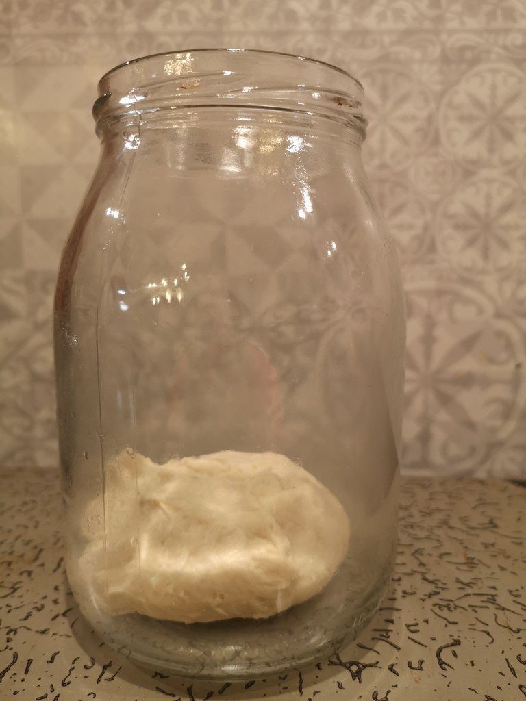 GIORNO 1: Partiamo aggiungendo alla farina, l’acqua tiepida e il miele. La prima va aggiunta poco alla volta, questo ci permette di tenere sotto controllo la consistenza del panetto che stiamo impastando. Deve essere umido, appiccicoso ma non liquido o viscido. Fatto questo, impastiamo per 5/10 minuti in modo di attivare il procedimento. Mettiamo tutto nel vaso, facciamo una croce sul panetto con un coltello, questo serve per vedere la lievitazione, e copriamo il vaso con una garza umida. Questo composto ottenuto si chiama Starter.