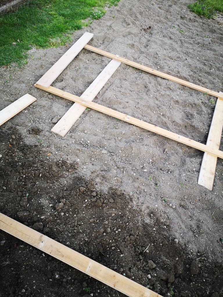 Purtroppo l’obbligo di stare a casa mi ha impedito di andare in negozio a prendere le assi e abbiamo cercato di fare con materiale di recupero che c’era gia’ in casa. Alla fine abbiamo optato per vecchi listelli di legno recuperati da qualche lavoro di edilizia casalingo. Mentre altre cose siamo riuscite a recuperarle online come reti e archi per struttura reti.