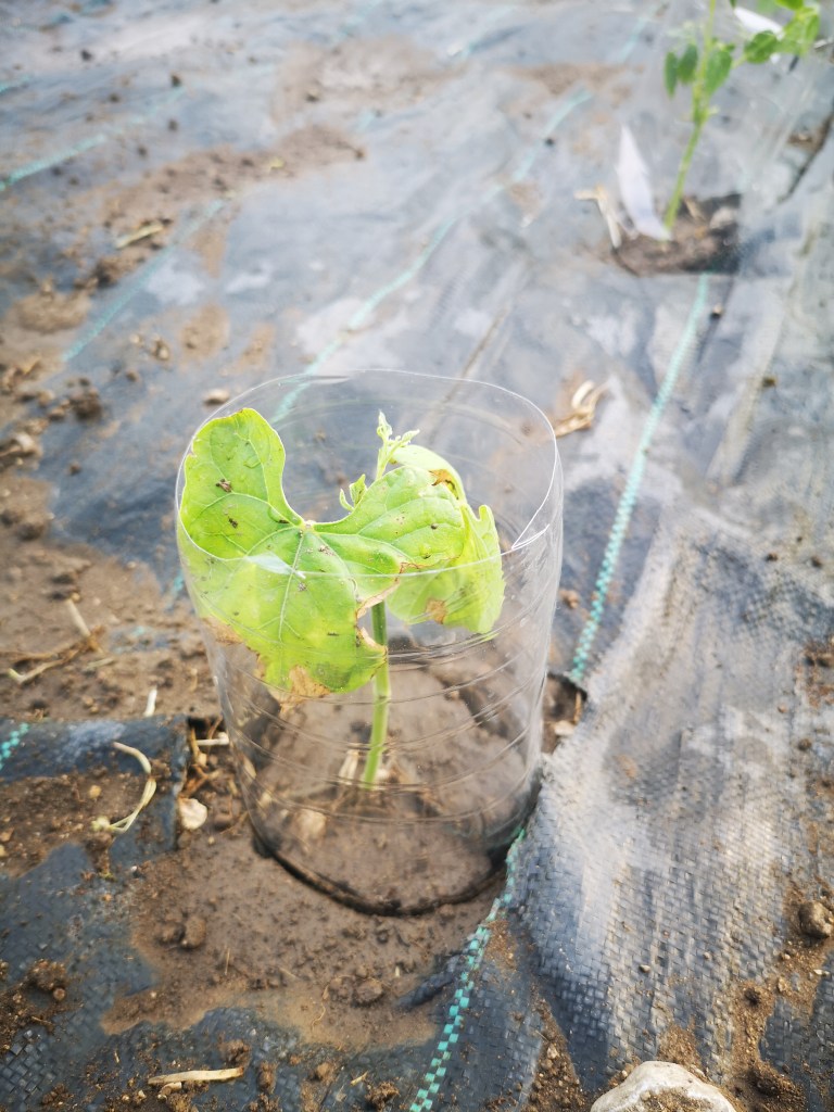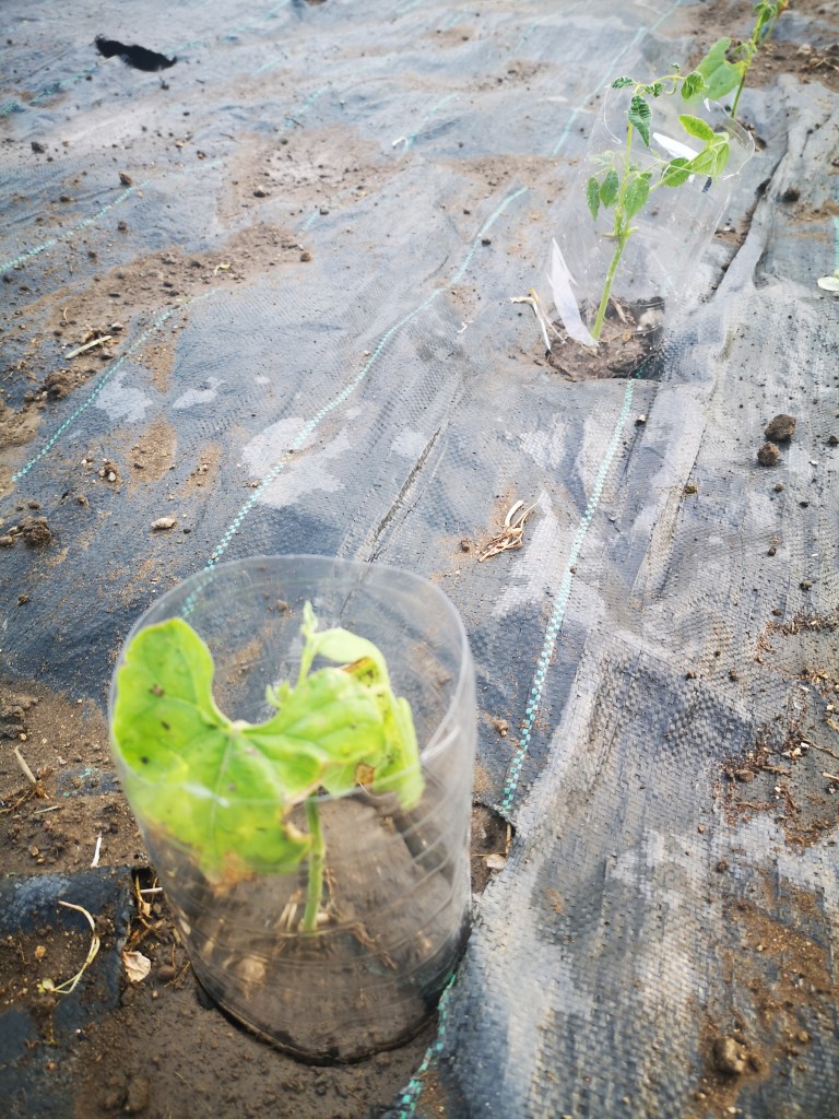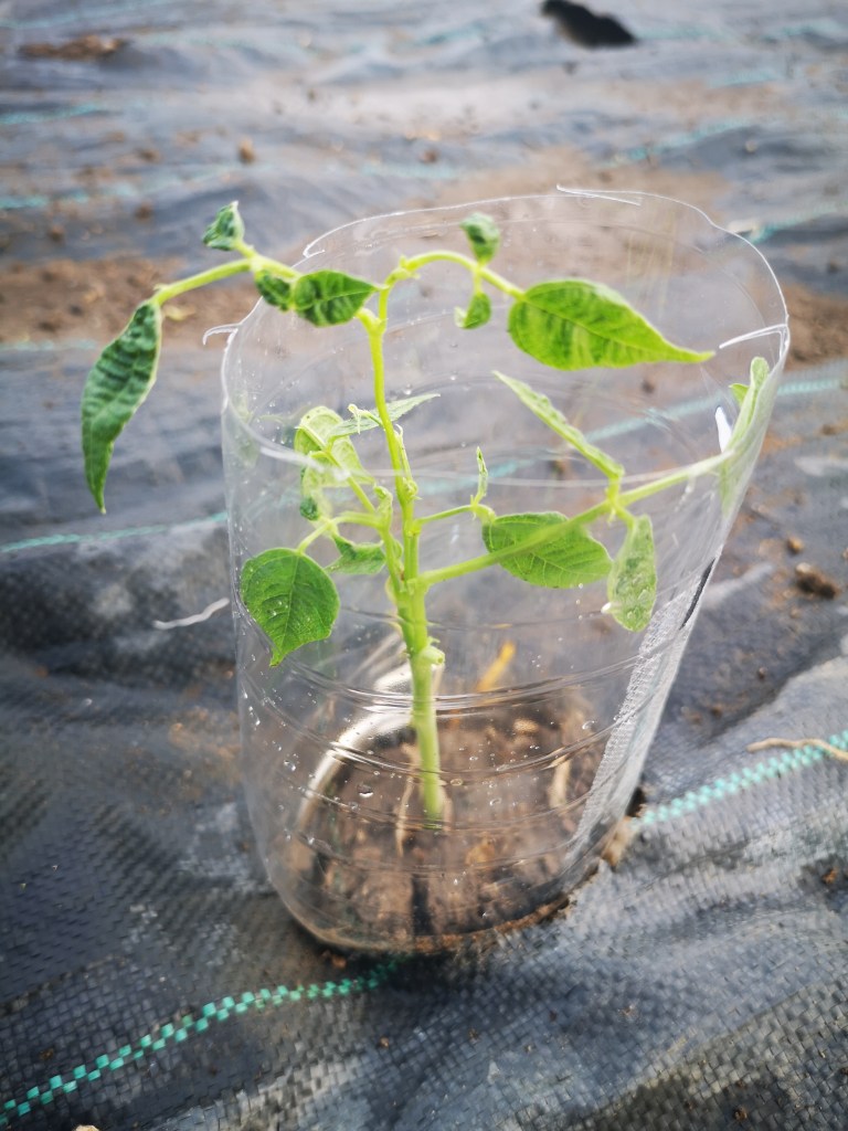Per ora li lascero’ cosi, direi che sta funzionando bene. Appena i fusti saranno piu’ grandi e robusti TAGLIERO’ la plastica e lascero’ libera la base. Secondo me e’ una soluzione perfetta! Devo dire che abbiamo avuto giorni di vento forte e non sono volati via ne piante ne plastica!!!! ottimo dire!!!