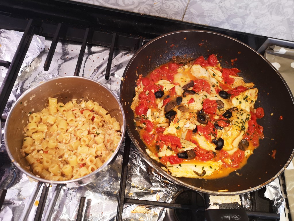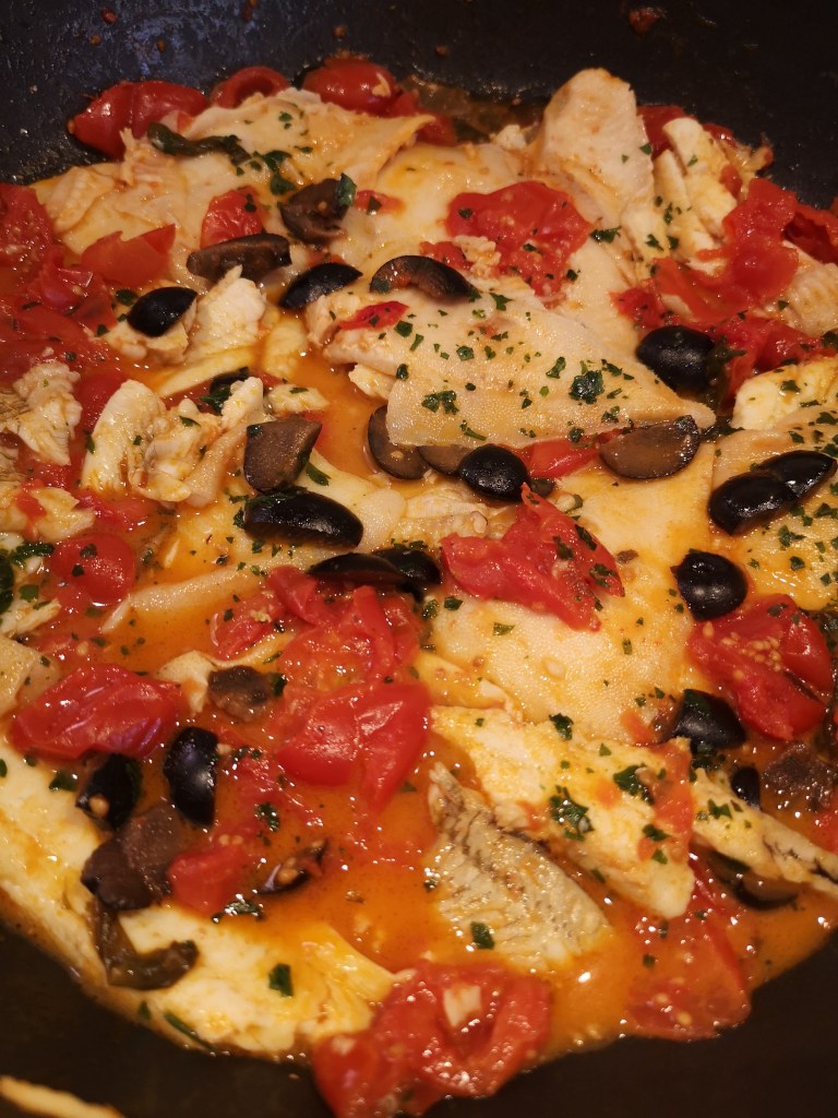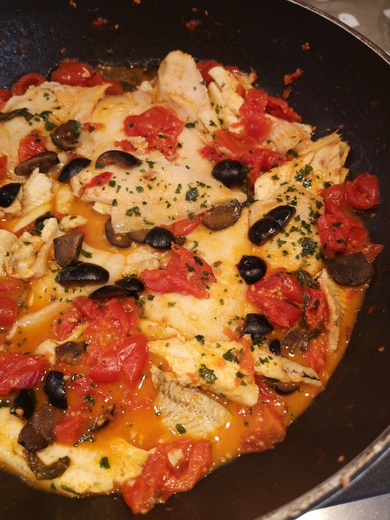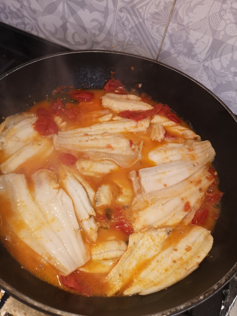 La ricetta e’ semplicissima! Platessa, pomodorini, pentola calda e per chi vuole olive nere o verdi e origano.