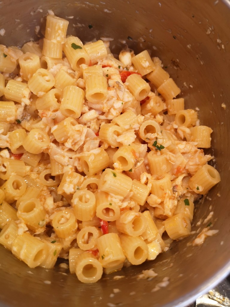 Una volta cotta per ben, ne ho tirato fuori una porzione, ho sminuzzato per bene il pesce e ne ho creato un ragu’ per la pasta di Diego. Neanche a dirlo l’ha SPOLVERATA!!!